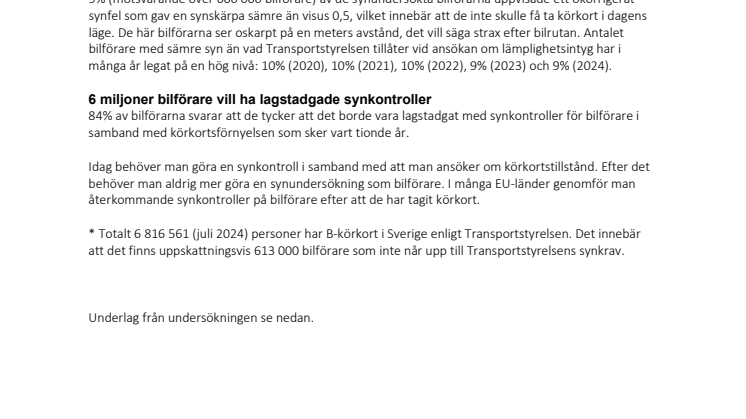 * Totalt 6 816 561 (juli 2024) personer har B-körkort i Sverige enligt Transportstyrelsen. Det innebär att det finns uppskattningsvis 613 000 bilförare som inte når upp till Transportstyrelsens synkrav vid ansökan om lämplighetsintyg för B-körkort.