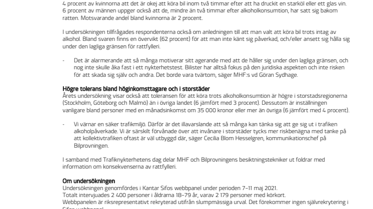 Bilprovningen och MHF gör en årlig enkät om trafiknykterhet, normer och beteenden i frågor om alkohol och bilkörning. I den senaste mätningen gjord av Kantar Sifo i maj 2021 anser 10 procent av de tillfrågade männen och 4 procent av kvinnorna att det är okej att köra bil inom två timmar efter att ha druckit en starköl eller ett glas vin. 6 procent av männen uppger också att de, mindre än två timmar efter alkoholkonsumtion, har satt sig bakom ratten. Motsvarande andel bland kvinnorna är 2 procent.