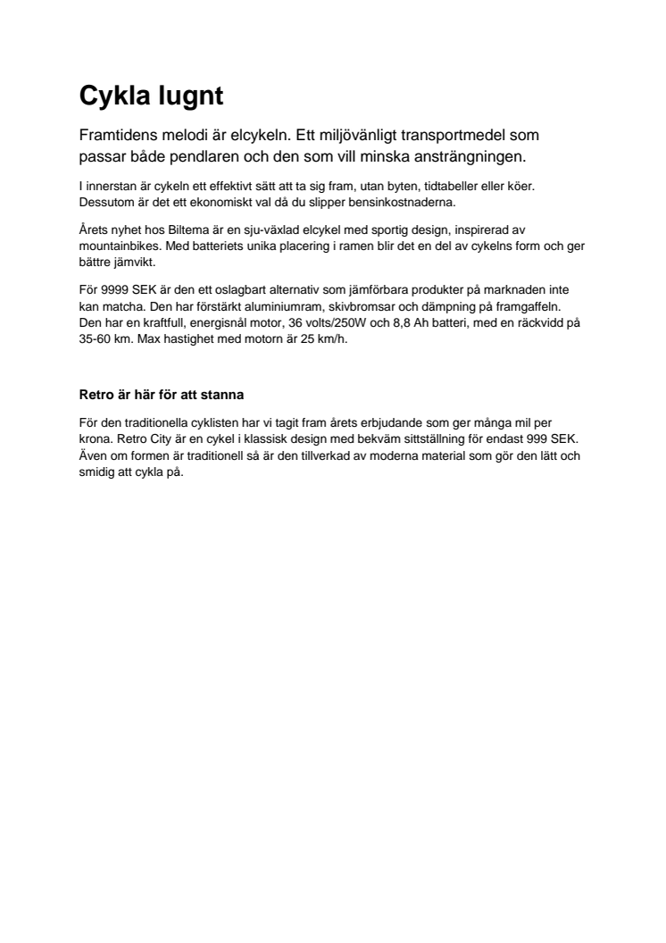Biltema presenterar stolt årets cykel-nyhet som är helt rätt i tiden. En sportig el-cykel som är både en miljövänlig och ekonomisk investering. Med en unik form och pris på endast 9999 SEK är den en oslagbar cykel.