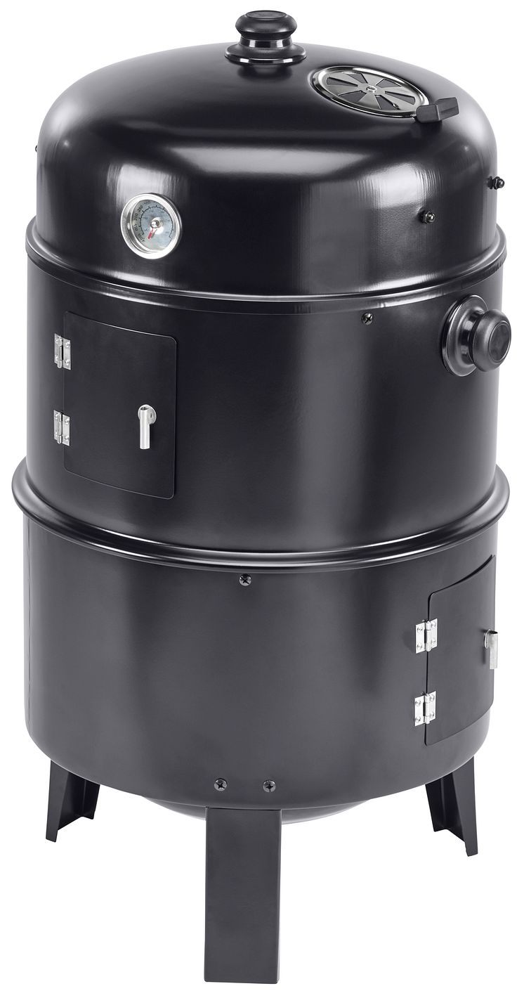 Stabil vertikalrök för hemmabruk, fungerar även som grill. Två våningar, två rökluckor samt termometer och reglerbar ventilationslucka i locket. Eldas med kol eller briketter.