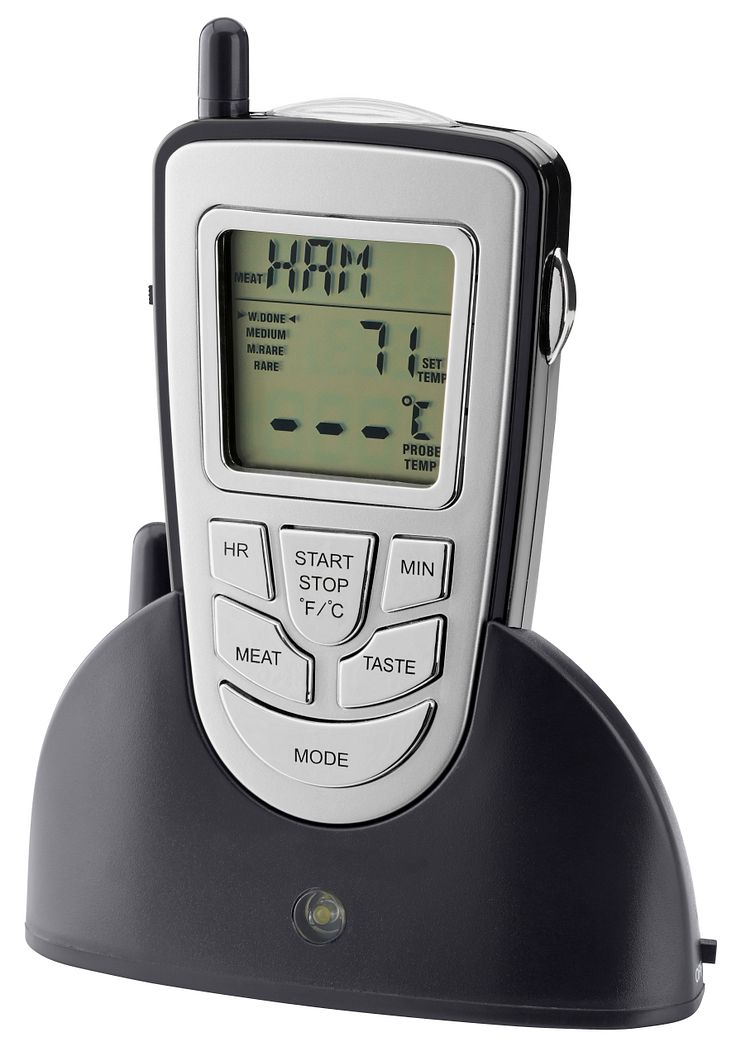 Trådlös stektermometer som gör det möjligt att lämna köket och ändå ha koll på maten. Användarvänlig med tydlig display, rejäla knappar och enkel inställning.