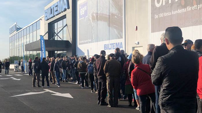 Torsdagsmorgonen bjöd på solsken och friska vindar denna krispiga höstmorgon då Biltema slog upp portarna till sitt nya varuhus i Falköping. Kön ringlade sig lång utmed parkeringen redan en halvtimme innan öppning.