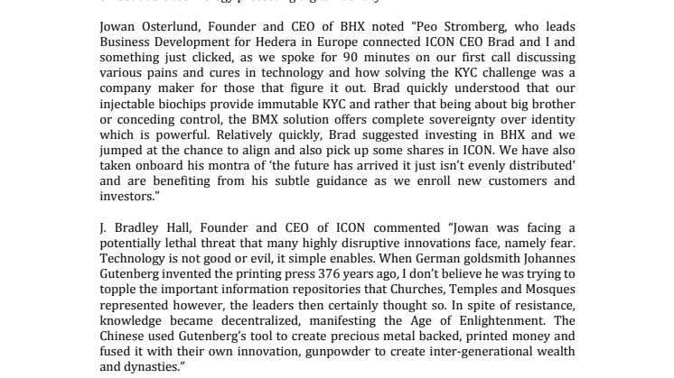Jowan Osterlund, Founder and CEO of BHX noted “Peo Stromberg, who leads Business Development for Hedera in Europe connected ICON CEO Brad and I and something just clicked, as we spoke for 90 minutes on our first call discussing various pains and cures in technology and how solving the KYC challenge was a company maker for those that figure it out. Brad quickly understood that our injectable biochips provide immutable KYC and rather that being about big brother or conceding control, the BMX solution offers complete sovereignty over identity which is powerful. Relatively quickly, Brad suggested investing in BHX and we jumped at the chance to align and also pick up some shares in ICON. We have also taken onboard his montra of ‘the future has arrived it just isn’t evenly distributed’ and are benefiting from his subtle guidance as we enroll new customers and investors.”
