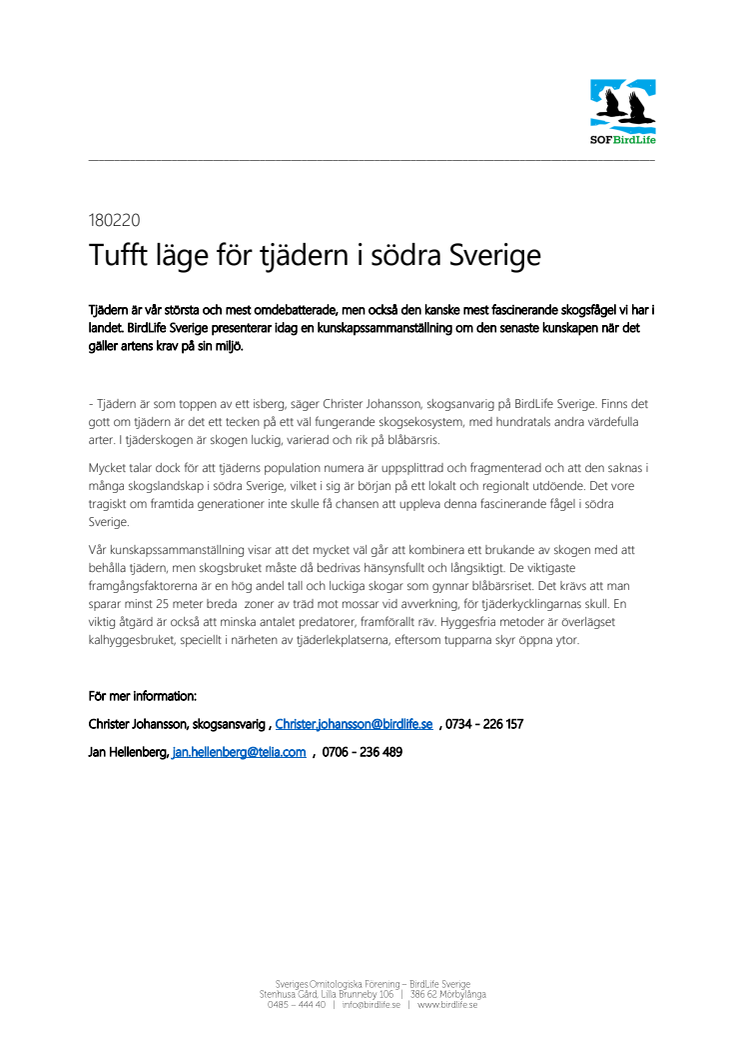 Tjädern är vår största och mest omdebatterade, men också den kanske mest fascinerande skogsfågel vi har i landet. BirdLife Sverige presenterar idag en kunskapssammanställning om den senaste kunskapen när det gäller artens krav på sin miljö.