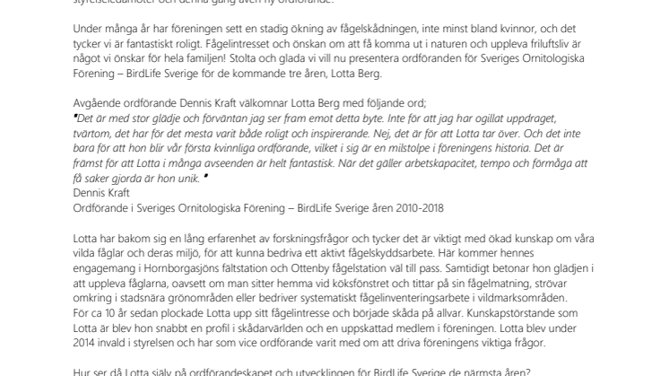 Hur ser då Lotta själv på ordförandeskapet och utvecklingen för BirdLife Sverige de närmsta åren?