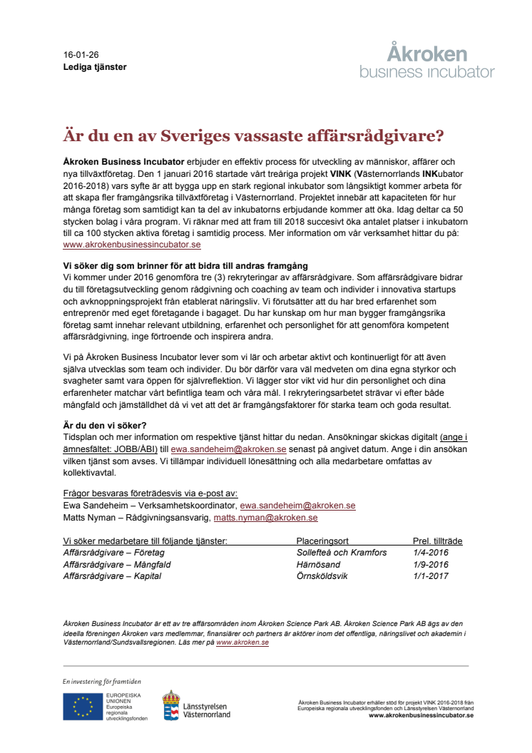 Åkroken Business Incubator söker tre nya affärsrådgivare med placering i Sollefteå/Kramfors, Härnösand och Örnsköldsvik. Som affärsrådgivare bidrar du till företagsutveckling genom rådgivning och coaching av team och individer i innovativa startups och avknoppningsprojekt från etablerat näringsliv. Vi söker specifikt dig som är specialiserad inom områdena mångfald eller kapital.