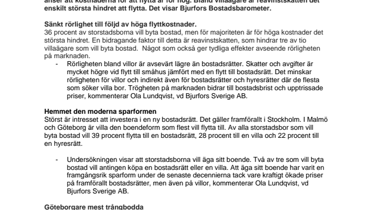 Var tredje storstadsbo i Stockholm, Göteborg och Malmö vill byta bostad. Men många anser att kostnaderna för att flytta är för hög. Bland villaägare är reavinstskatten det enskilt största hindret att flytta. Det visar Bjurfors Bostadsbarometer.