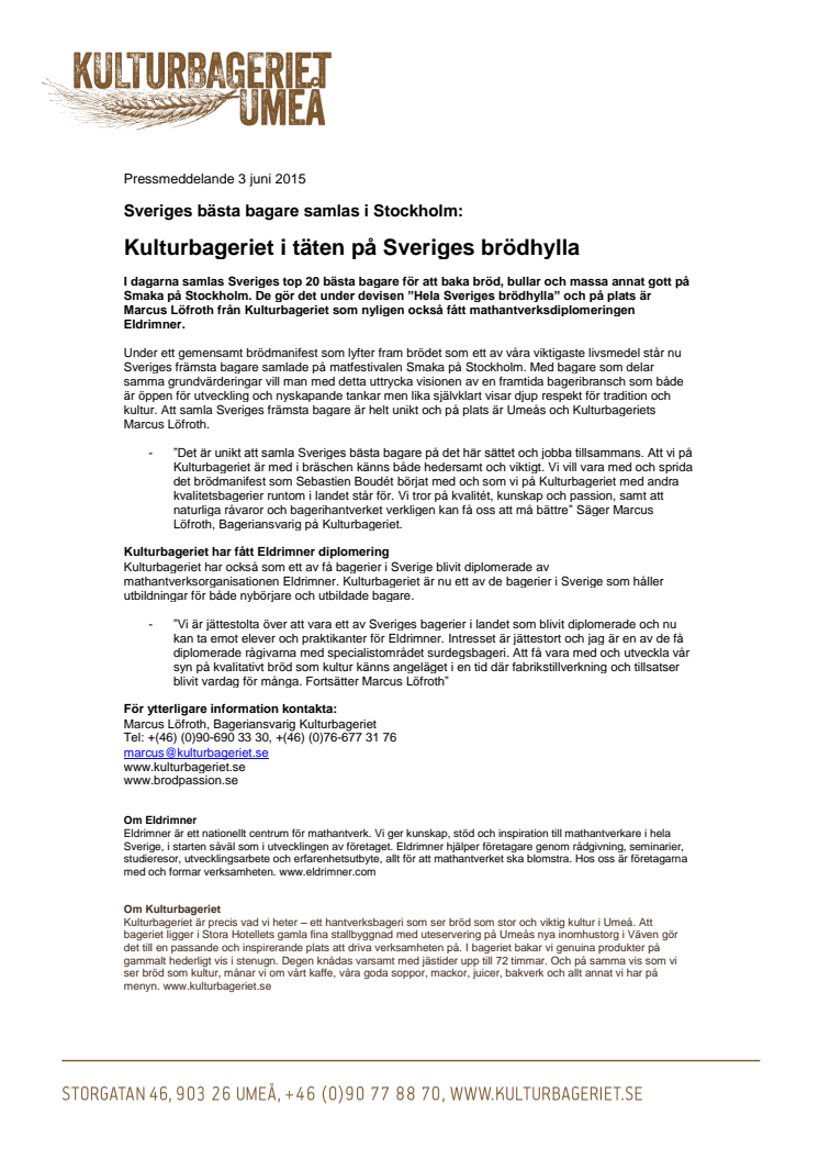 I dagarna samlas Sveriges top 20 bästa bagare för att baka bröd, bullar och massa annat gott på Smaka på Stockholm. De gör det under devisen ”Hela Sveriges brödhylla” och på plats är Marcus Löfroth från Kulturbageriet i Umeå.