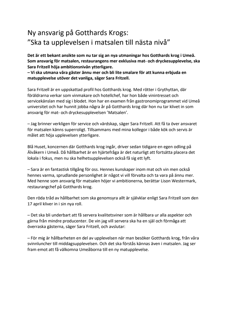 Det är ett bekant ansikte som nu tar sig an nya utmaningar hos Gotthards krog i Umeå. Som ansvarig för matsalen, restaurangens mer exklusiva mat- och dryckesupplevelse, ska Sara Fritzell höja ambitionsnivån ytterligare.