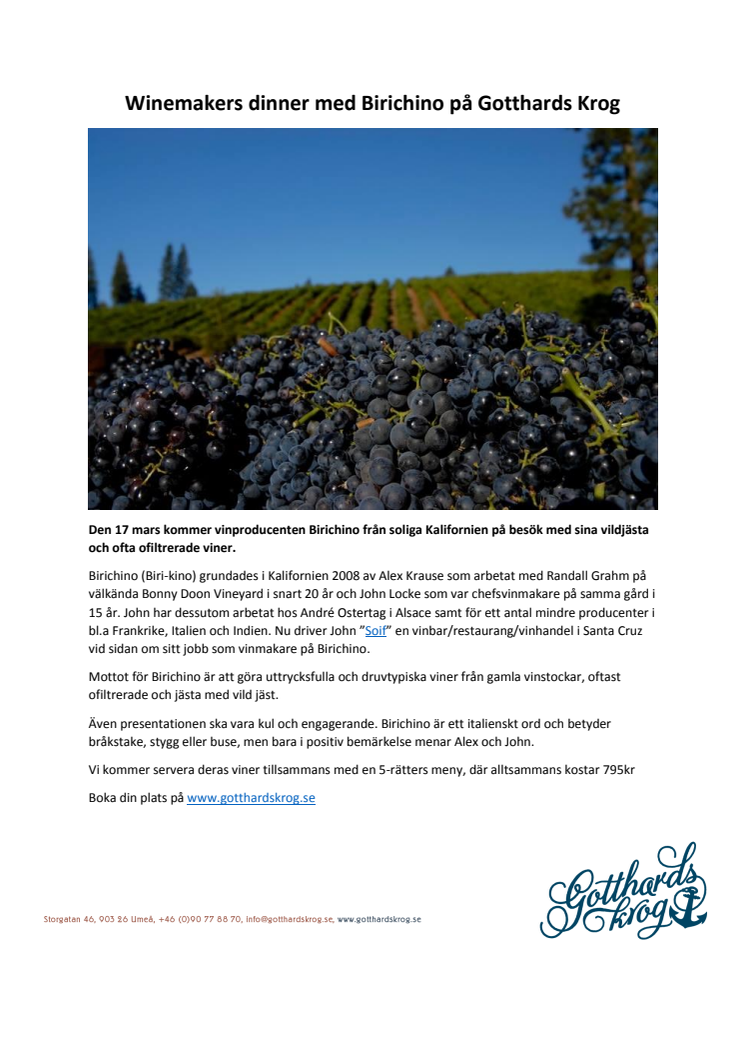 Den 17 mars kommer vinproducenten Birichino från soliga Kalifornien på besök med sina vildjästa och ofta ofiltrerade viner.