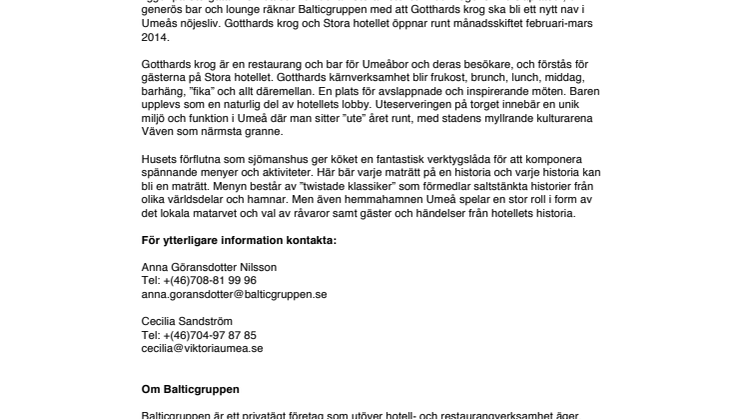 Balticgruppen presenterar sitt senaste tillskott i sin restaurangsfär: Gotthards krog. Krogen ligger på Storgatan i Umeå som en del av Stora hotellet. Med krogens 170 sittplatser, en generös bar och lounge räknar Balticgruppen med att Gotthards krog ska bli ett nytt nav i Umeås nöjesliv. Gotthards krog och Stora hotellet öppnar runt månadsskiftet februari-mars 2014.