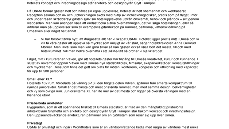 Den 8 september öppnar U&Me, ett nytt hotell mitt i centrala Umeå. Hotellet, vars arkitektur påminner om en björkstam, ligger på våningarna 6-13 i Umeås nya kulturarena Väven. I rummen är sängarna vända mot utsikten, antingen över Umeälven eller mot Umeå. U&Me är ritat av den prisbelönta arkitektbyrån Snøhetta. Bakom hotellets koncept och inredningsdesign står arkitekt- och designbyrån Stylt Trampoli.