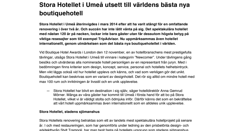Vid Boutique Hotel Awards i London den 12 november, en av hotellbranschens mest prestigefulla tävlingar, utsågs Stora Hotellet i Umeå till vinnare i kategorin ”Newcomer”. Under tävlingens gång besöks och utvärderas alla nominerade hotell personligen av en representant från juryn. Med i bedömningen finns kriterier som design, koncept, service, personal och hotellets helhetsintryck. Men vikt läggs också vid hur hotellet upplevs och känns, och vad som verkligen gör det unikt. Boutiquehotell kan beskrivas som en variant av designhotell. Det rör sig alltid om mindre hotell med max 100 rum och inriktningen är livsstil och en unik upplevelse.