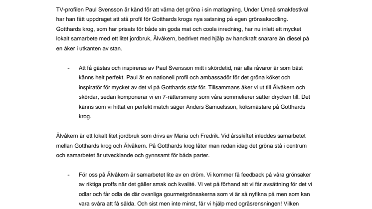 TV-profilen Paul Svensson är känd för att värna det gröna i sin matlagning. Under Umeå smakfestival har han fått uppdraget att stå profil för Gotthards krogs nya satsning på egen grönsaksodling. Gotthards krog, som har prisats för både sin goda mat och coola inredning, har nu inlett ett mycket lokalt samarbete med ett litet jordbruk, Älvåkern, bedrivet med hjälp av handkraft snarare än diesel på en åker i utkanten av stan.