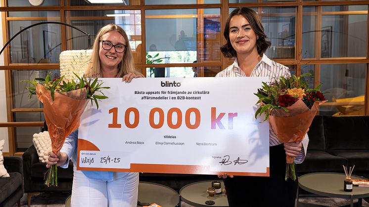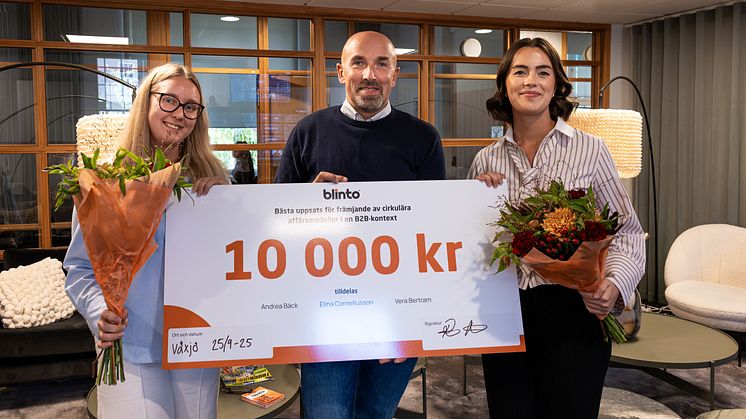 Tre nyutexaminerade ekonomistudenter från Linnéuniversitetet har tilldelats Blintos nyinstiftade stipendium inom cirkulär ekonomi. För sin examensuppsats om cirkulära affärsmodeller i en B2B-kontext, med koppling till tre företag i Kronoberg, fick de motta checken på 10 000 kronor på Blintos huvudkontor i Växjö.