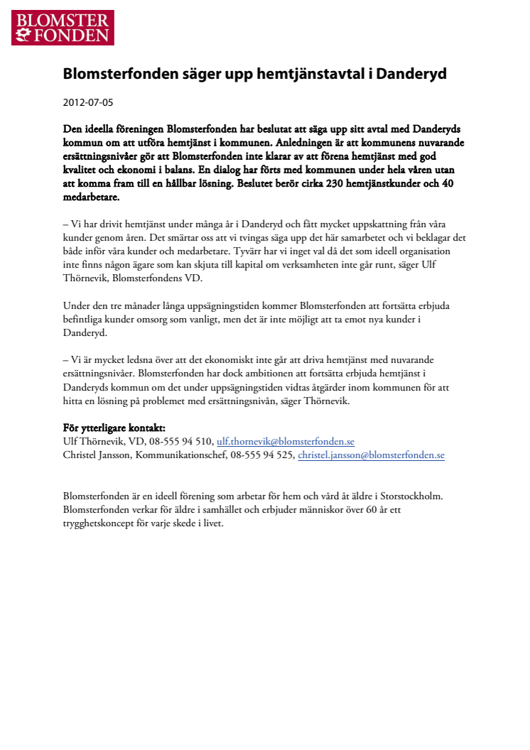 – Vi är mycket ledsna över att det ekonomiskt inte går att driva hemtjänst med nuvarande ersättningsnivåer. Blomsterfonden har dock ambitionen att fortsätta erbjuda hemtjänst i Danderyds kommun om det under uppsägningstiden vidtas åtgärder inom kommunen för att hitta en lösning på problemet med ersättningsnivån, säger Thörnevik.