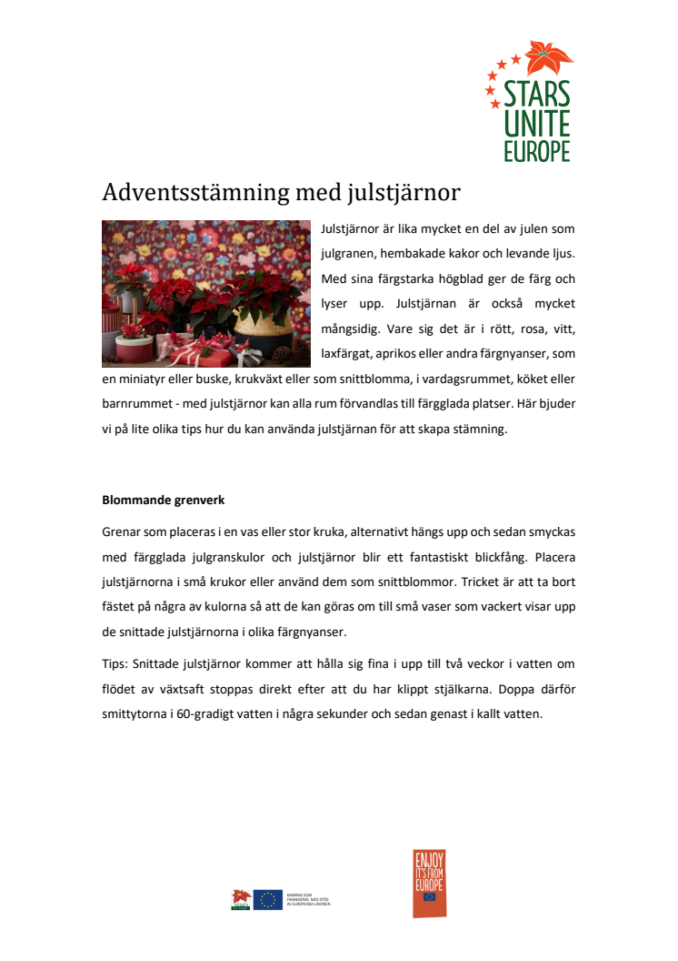 Julstjärnor är lika mycket en del av julen som julgranen, hembakade kakor och levande ljus. Med sina färgstarka högblad ger de färg och lyser upp. Här bjuder vi på lite olika tips hur du kan använda julstjärnan för att skapa stämning.