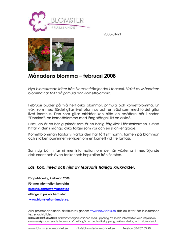 Nya blomstrande idéer från Blomsterfrämjandet i februari. Valet av Månadens blomma har fallit på primula och kornettblomma.