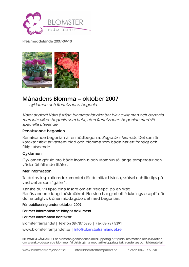 Valet är gjort! Våra ljuvliga blommor för oktober blev cyklamen och begonia men inte vilken begonia som helst, utan Renaissance begonian med sitt speciella utseende.