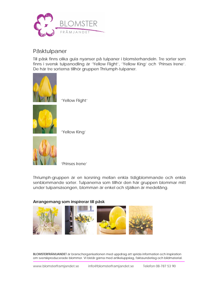 Till påsk finns olika gula nyanser på tulpaner i blomsterhandeln. Tre sorter som finns i svensk tulpanodling är Yellow Flight, Yellow King och Prinses Irene.
