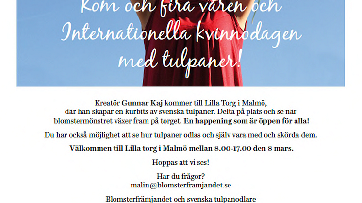 Kreatör Gunnar Kaj kommer till Lilla Torg i Malmö, där han skapar en kurbits av svenska tulpaner. Delta på plats och se när blomstermönstret växer fram på torget. En happening som är öppen för alla! Välkommen till Lilla torg i Malmö mellan 8.00-17.00 den 8 mars på internationella kvinnodagen. Hoppas att vi ses! Blomsterfrämjandet och svenska tulpanodlare