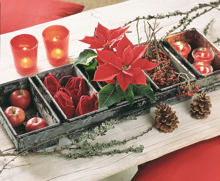 Fynda på loppmarknader, i källare och i vindsutrymmen. Här har gamla bakformar fyllts med klart röda julstjärnor och färgglada dekorationer som rödkindade äpplen, små påsar i sammet, nypon och ljus.