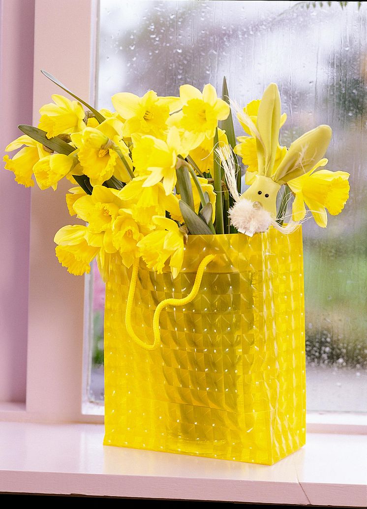 Presentpåsar i gult eller i andra vårfärger finns att tillgå i de flesta butiker. Ställ ner hela lökkrukan i påsen som också blir ett naturligt stöd för stjälkarna.