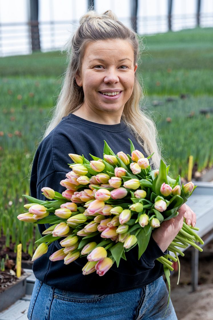 Caroline Nilsson med ett fång tulpaner från Målsta Blommor i Sundsvall