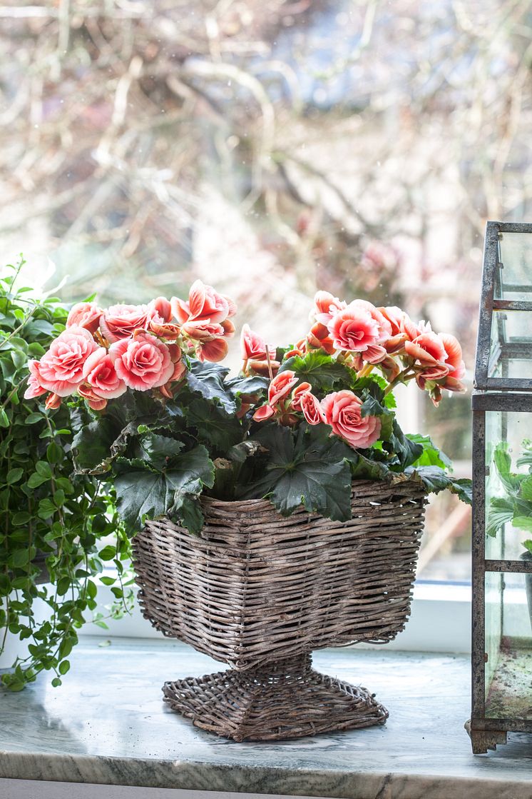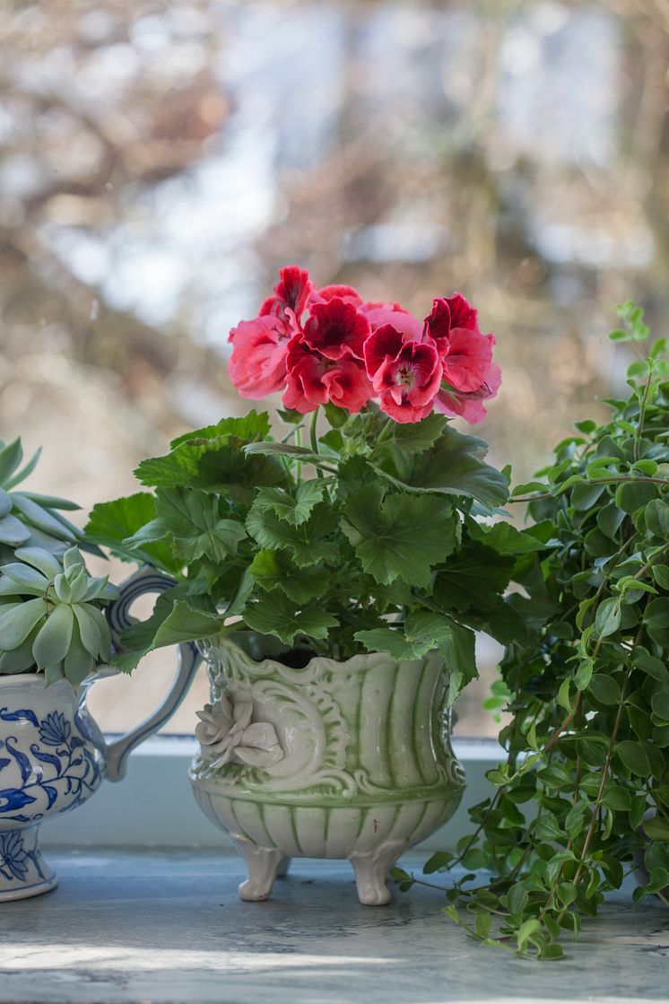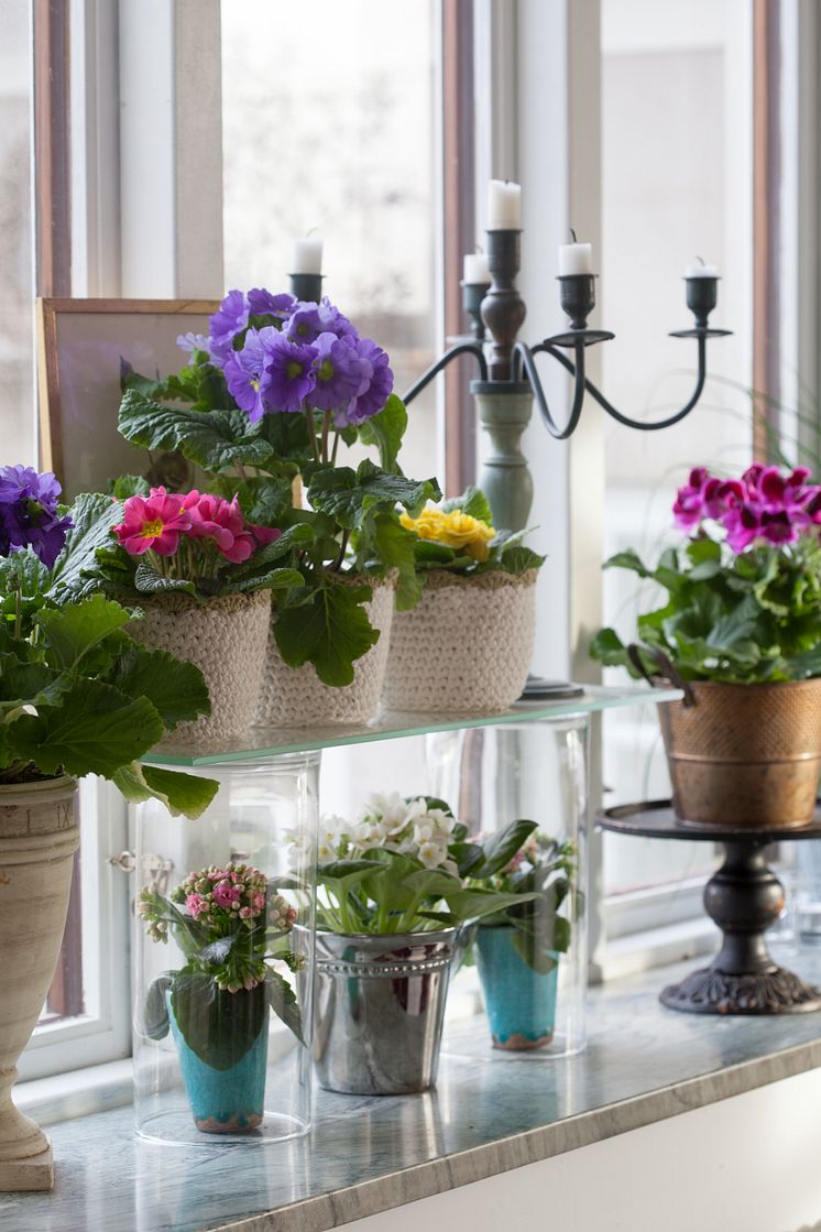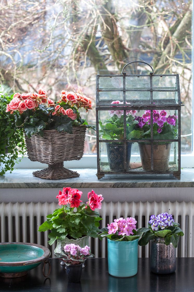 Vår på fönsterbrädan med begonia, primula, engelsk pelargon och saintpaulia. Bild får användas av press samt av Blomsterfrämjandets medlemmar och sponsorer. Blomsterfrämjandet/Minna Mercke Schmidt måste anges som by-line.