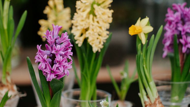 Köp hem krukodlade vårhyacinter och minipåskliljor, eller andra fina vårlökar i kruka. Leta rätt på små glasvaser, ställ dem i en grupp och fyll på med kallt vatten. Lossa försiktigt hyacinter och minipåskliljor från varandra och ta upp lökarna ut krukan. Skölj försiktigt av jorden och led ner rötterna i vasen. Klart!