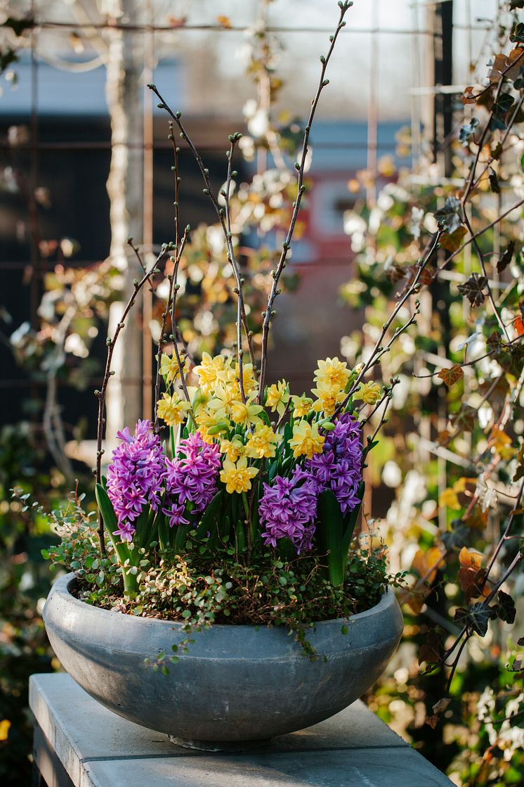 En samplantering med vårens lökväxter vid entrén är mycket inbjudande. Alla lökväxter som odlas i Sverige vid den här tiden har fördelen att de är tåliga för kyla. Vårhyacint och vita pärlhyacinter gifter sig fint.