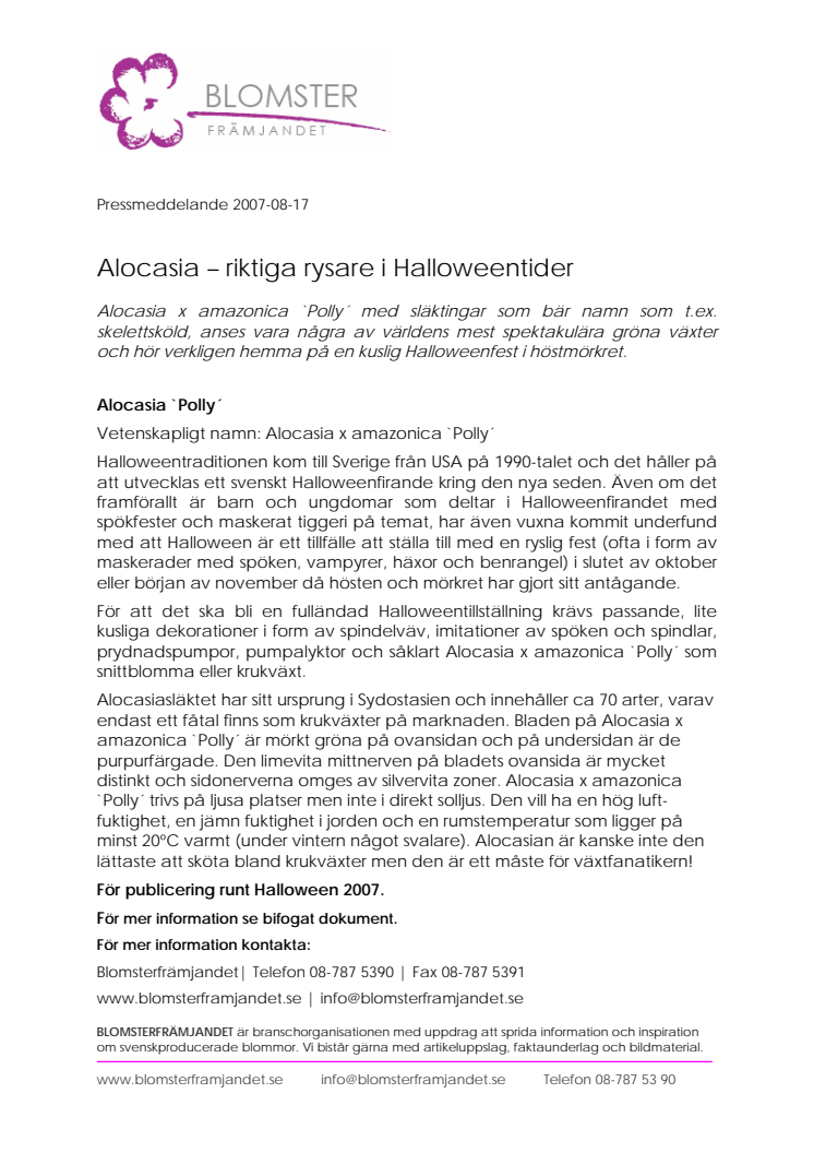 För att det ska bli en fulländad Halloweentillställning krävs passande, lite kusliga dekorationer i form av spindelväv, imitationer av spöken och spindlar, prydnadspumpor, pumpalyktor och såklart Alocasia x amazonica `Polly´ som snittblomma eller krukväxt.
