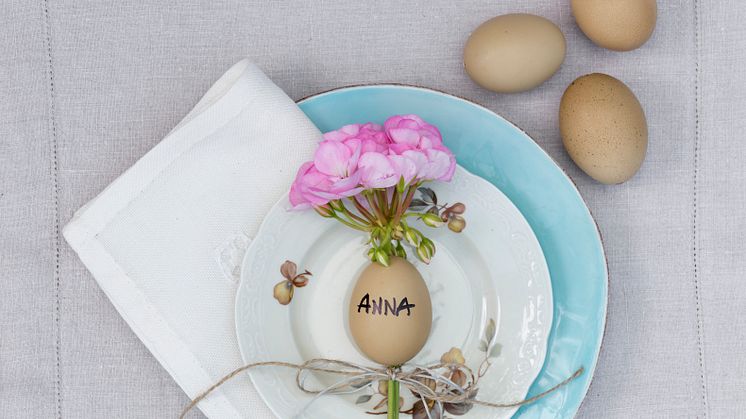 Glad påsk! En blommande pelargon som sticks genom ett urblåst ägg och placeras mitt på tallriken är ett charmigt sätt att välkomna dina gäster på. Om du vill kan du skriva namnet på den som ska sitta på platsen på ägget och knyta ett snöre runt pelargonstjälken för ytterligare finess. Vill du ha det extra påskigt kan du byta till ett gult band och en gul tallrik.