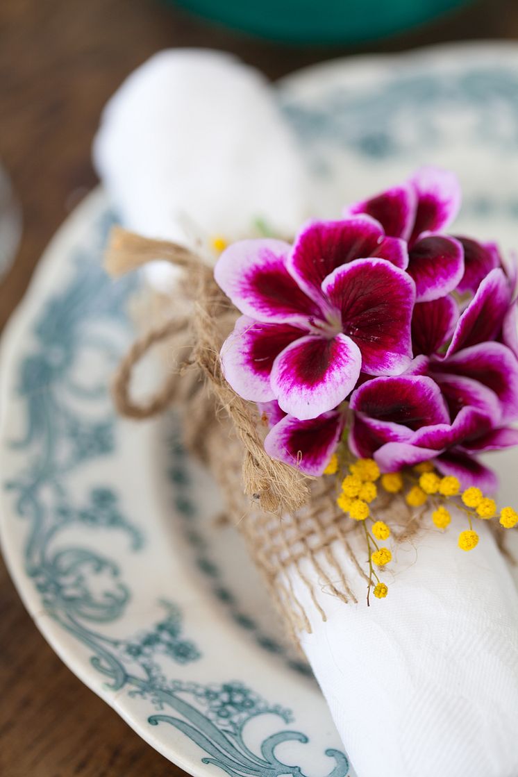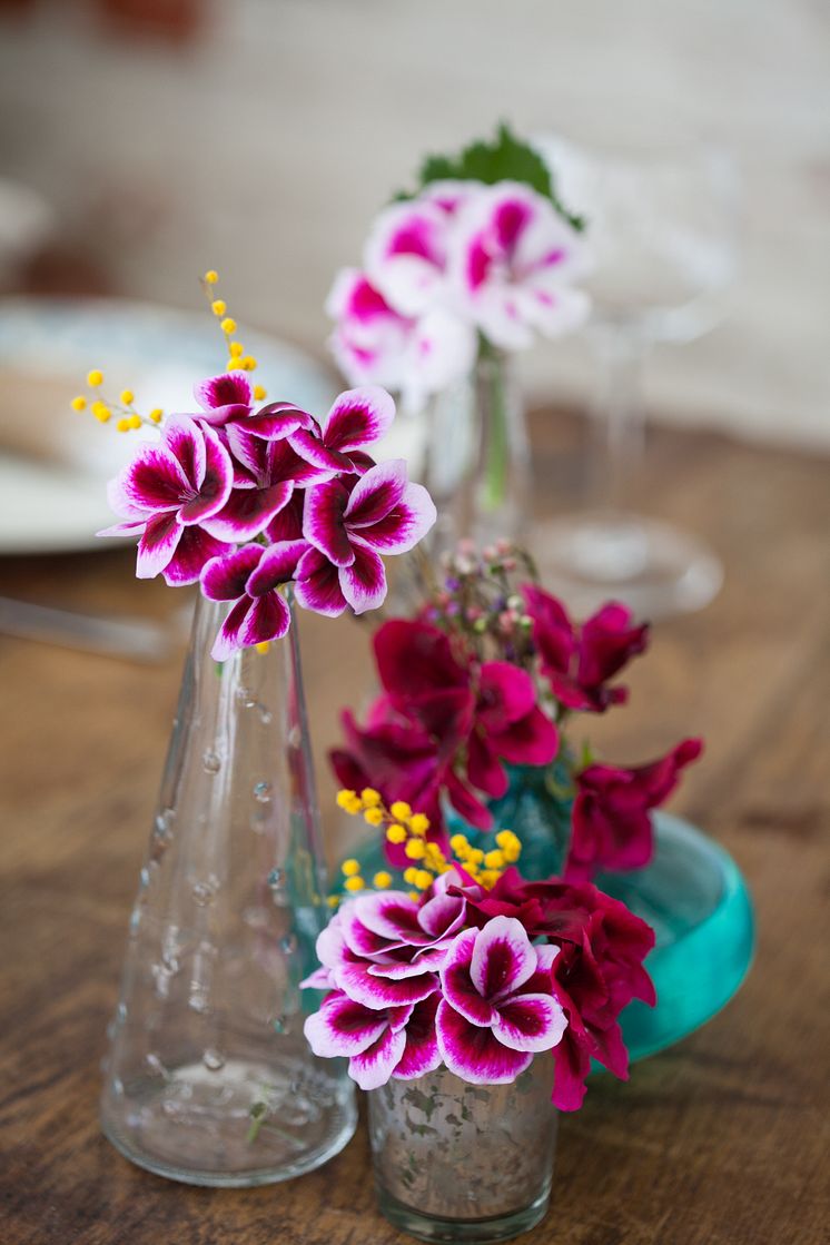 Oavsett om du ska duka utomhus eller inomhus, en enkel frukost till dig själv eller en middag för hela släkten ger en omsorgsfull dukning något extra till måltiden. Blommor är enkelt att duka med; de tillför färg och liv och är busenkla att lyckas med. Det finns en uppsjö att välja bland och en av favoriterna är pelargonen. Denna sydafrikanska skönhet finns i mängder av färger och dess rikblommighet gör att blommorna räcker länge. Här delar vi med oss några dukningstips!
