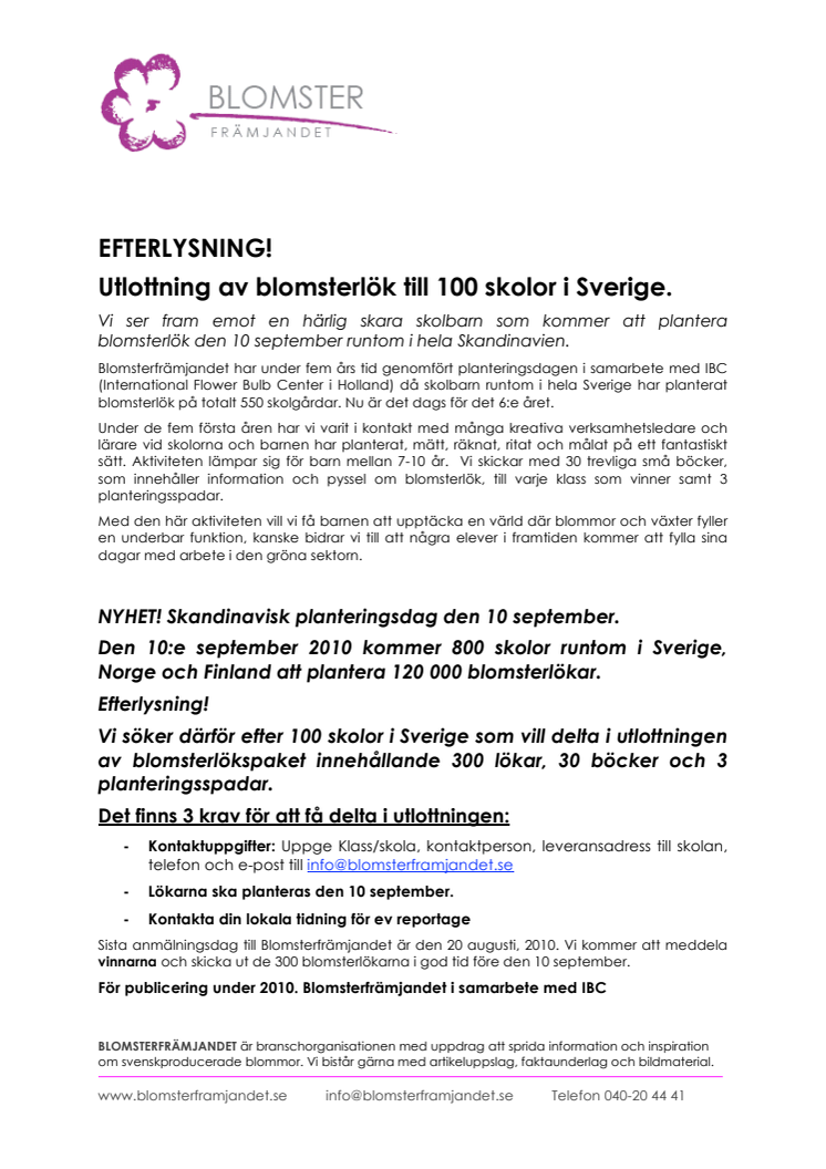 Sista anmälningsdag till Blomsterfrämjandet är den 20 augusti, 2010. Vi kommer att meddela vinnarna och skicka ut de 300 blomsterlökarna i god tid före den 10 september.