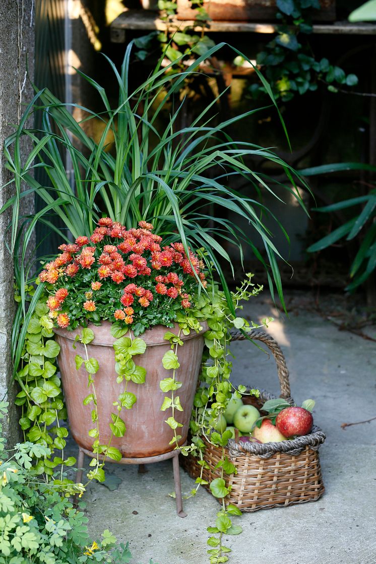Här får krysantmum sällskap av penningblad och prydnadsgräs och en korg med äpplen i skördetider. Foto: Annika Christensen/Blomsterfrämjandet.