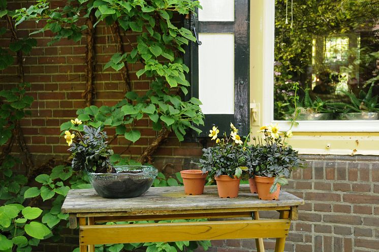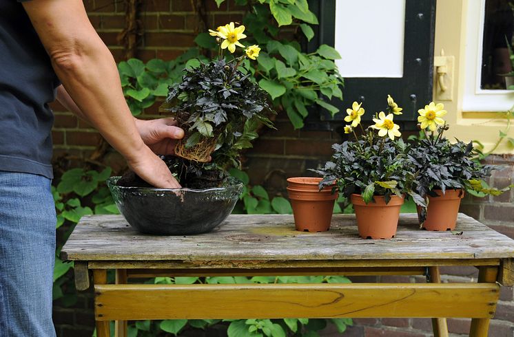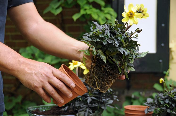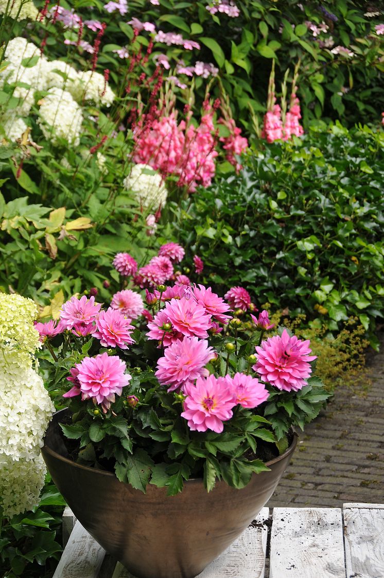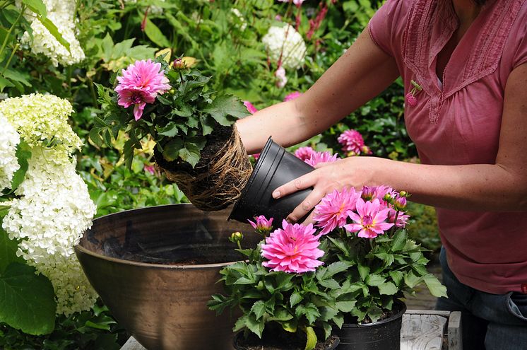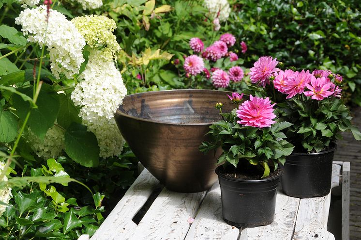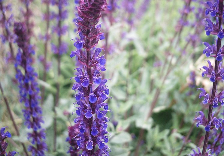 Stäppsalvia hittar vi i olika blå nyanser men även i vitt och rosa medans sommardahlior kan erbjuda ett helt annat spektrum av färger. Som så många andra växter mår även de här bra av att man tar bort vissna blommor för att stimulera till att nya slår ut i en bra och jämn takt.
