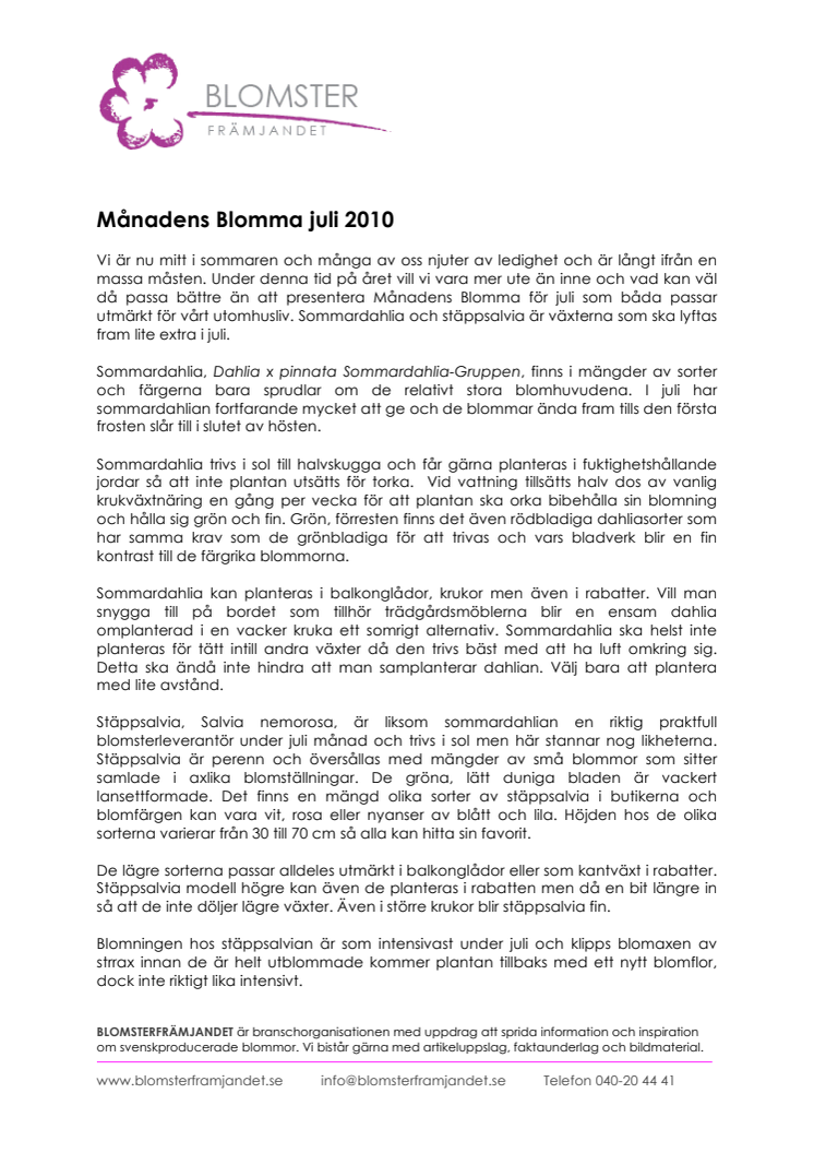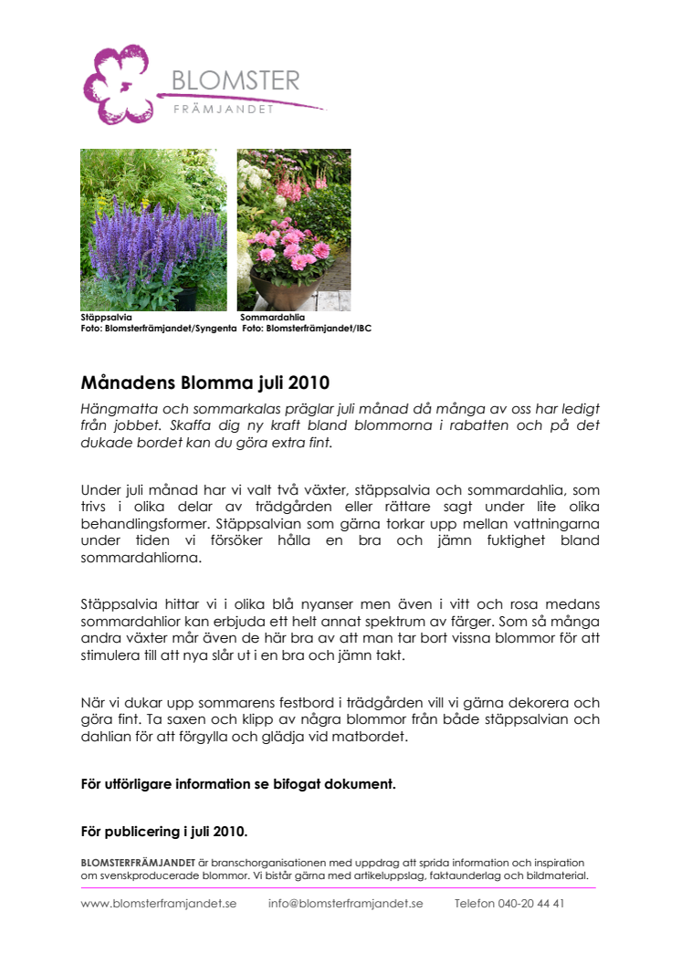 Under juli månad har vi valt två växter, stäppsalvia och sommardahlia, som trivs i olika delar av trädgården eller rättare sagt under lite olika behandlingsformer. Stäppsalvian som gärna torkar upp mellan vattningarna under tiden vi försöker hålla en bra och jämn fuktighet bland sommardahliorna.