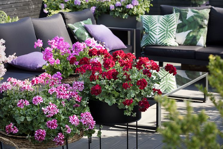 Pelargoner passar bra att välkomna gäster med. Tillsammans med moderna och stilrena krukor och amplar ger de ett städat och sobert intryck. Välj pelargoner i liknande färgnyanser och komplettera med gråa och gröna växter. Gråa växter har en förmåga att lugna ner planteringar och skapa harmoni.