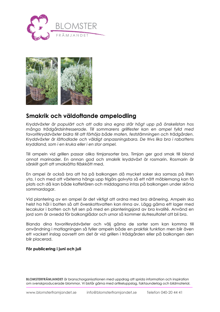 Kryddväxter är populärt och att odla sina egna står högt upp på önskelistan hos många trädgårdsintresserade. Till sommarens grillfester kan en ampel fylld med favoritkryddväxter bidra till att förhöja både maten, feststämningen och trädgården. Kryddväxter är lättodlade och väldigt anpassningsbara. De trivs lika bra i rabattens kryddland, som i en kruka eller i en stor ampel.