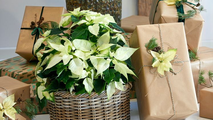 Krämfärgade julstjärnor passar perfekt till en minimalistisk jul i skandinavisk stil. Med sina stjärnformade högblad får de en riktigt festlig känsla i julgranar och på presenter. Här fungerar skurna julstjärnor fantastiskt, instoppade i julgranskulor som vaser med hängöglorna borttagna.