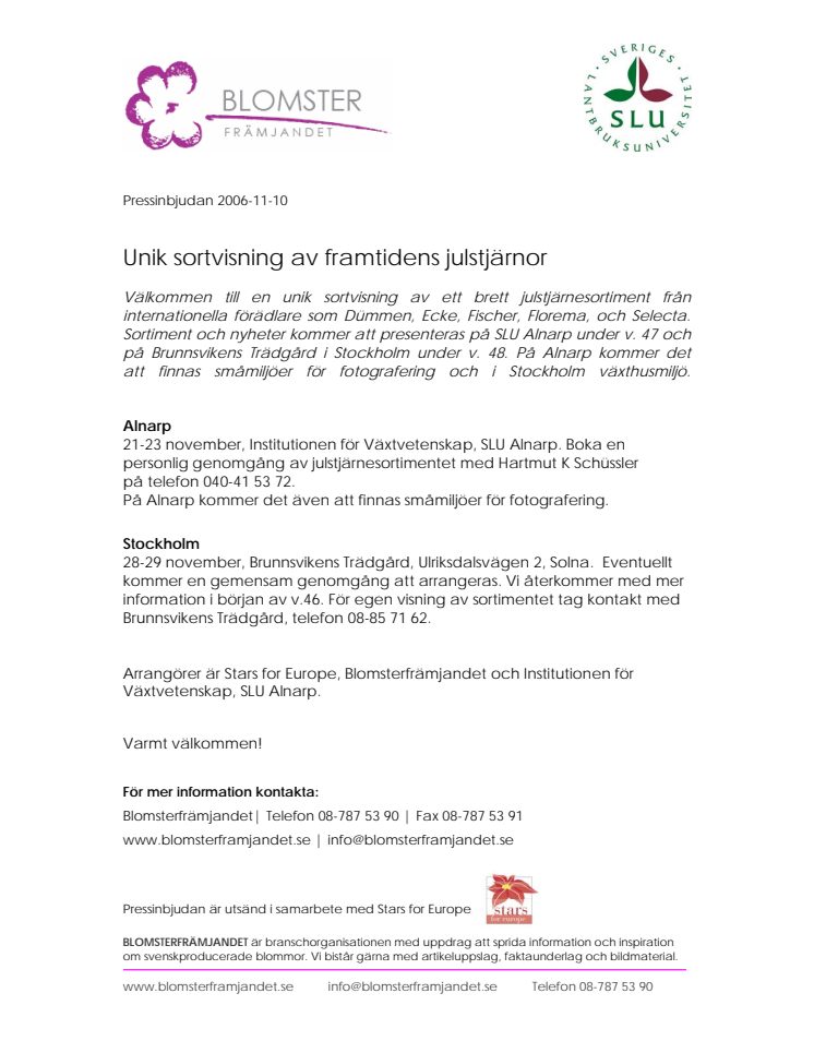 Välkommen till en unik sortvisning av ett brett julstjärnesortiment från internationella förädlare som Dümmen, Ecke, Fischer, Florema, och Selecta. Sortiment och nyheter kommer att presenteras på SLU Alnarp under v. 47 och på Brunnsvikens Trädgård i Stockholm under v. 48. På Alnarp kommer det