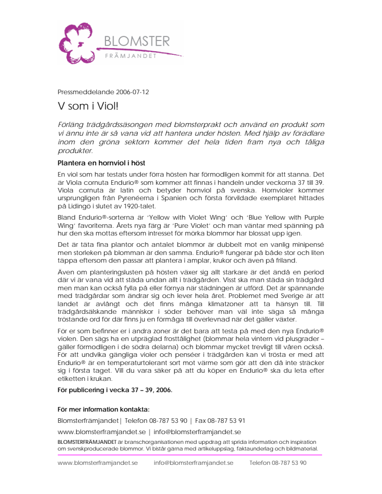 En viol som har testats under förra hösten har förmodligen kommit för att stanna. Det är Viola cornuta Endurio® som kommer att finnas i handeln under veckorna 37 till 39. Viola cornuta är latin och betyder hornviol på svenska. Hornvioler kommer ursprungligen från Pyrenéerna i Spanien och första förvildade exemplaret hittades på Lidingö i slutet av 1920-talet.