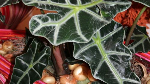 Alocasia x amazonica `Polly´ med släktingar som bär namn som t.ex. skelettsköld, anses vara några av världens mest spektakulära gröna växter och hör verkligen hemma på en kuslig Halloweenfest i höstmörkret.