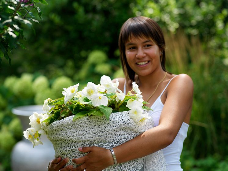 Stor tagetes (Tagetes erecta 'Vanilla') med batat i förgrunden
