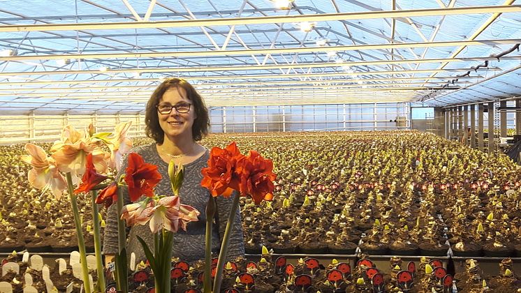 Lena Karlsson, VD på Gustafslunds Handelsträdgård i ett hav av amaryllis
