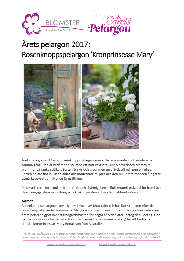 • Årets Pelargon 2017: Rosenknoppspelargon ’Kronprinsesse Mary’