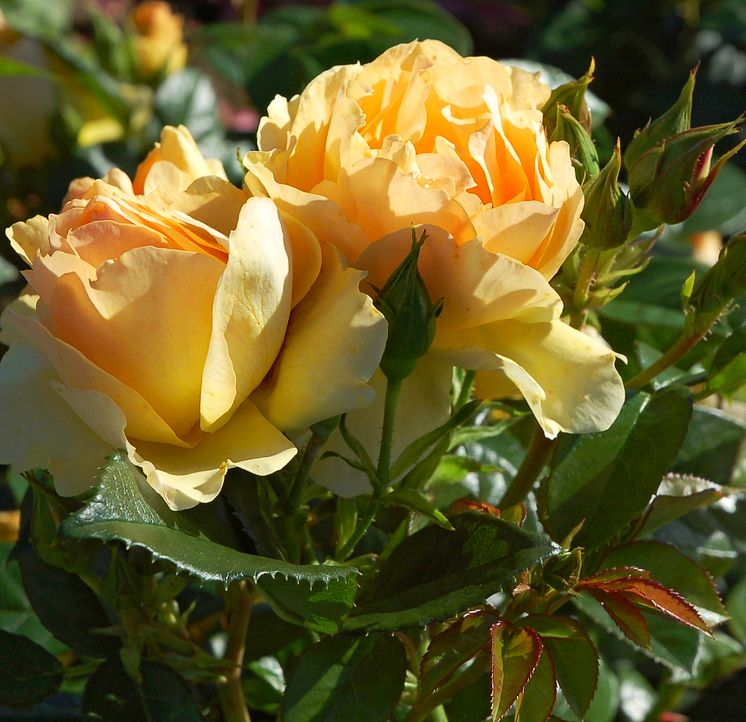 Årets favoritros hos Blomsterlandet är en vacker ros med aprikosfärgade blommor som skiftar i mörkt gult till aprikos. Sorten heter ’Hansestadt Rostock’ och är en floribundaros med ett kompakt och relativt lågt växtsätt. Bilden får användas i redaktionella sammanhang om Blomsterlandet anges som källa.
