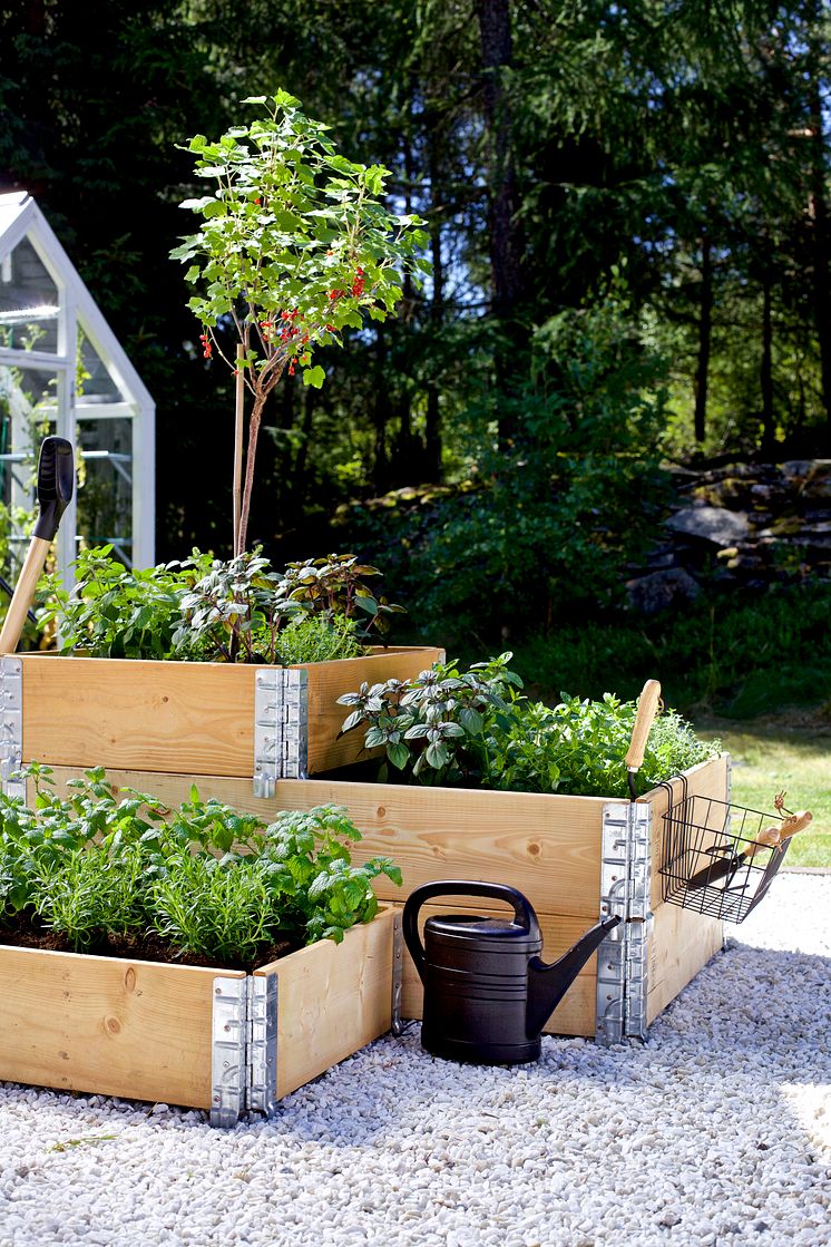 I vårt första exempel har vi behållit den rektangulära formen i grunden och satt ihop två ramar ovanpå varandra. Ovanpå dessa har vi satt en mindre ram, som är kvadratisk. Den är byggd av 4 st kortsidor. Den tredje kvadraten på marken är byggd av 4 st långsidor. De två kvadratiska ramarna är alltså byggda av sammanlagt två pallkragar, men vi har satt ihop kortsidorna med varandra i en form, och sedan långsidorna i en annan.