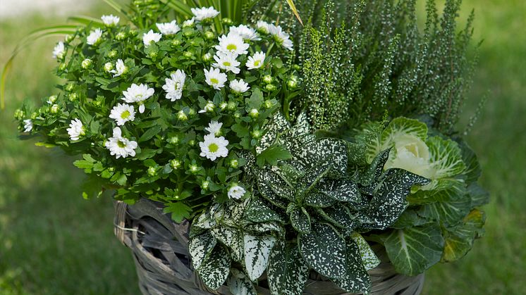 Höstkruka - blandade växter planterade i frosttålig kruka